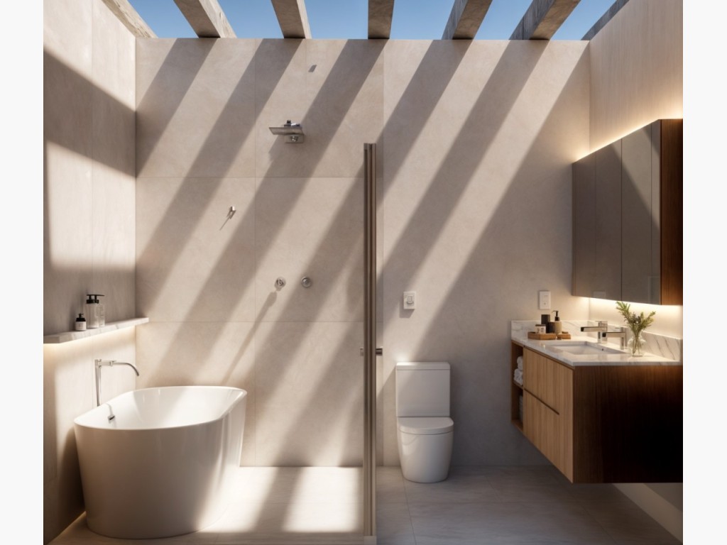 Banheiros e lavanderia com teto de vidro, permitindo uma experiência única de iluminação natural
